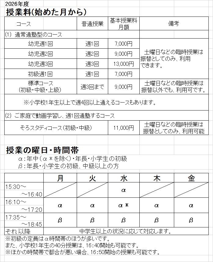 「通常通塾型」では週1~3回、「そろスタディ型」では週1回選んで通えます。多くの場合、入会の際に、曜日時間帯を決めて登録(「定期登録」)します。(定期登録をせずにご入会できますが、出席の都度の連絡が必要です。) なお、登録した曜日時間帯に都合が悪い場合、振替が可能です。(週2回以上通えるコースを選択する場合は、定期登録せずに、その都度連絡して通うこともできます。この場合でも、後で新規に授業を定期登録できます。) 初級の方が珠算5級に合格すると、中級となります。中級になった翌月頃から、β時間帯を利用する方が多くなります。β時間帯は17:20から入室でき、全体では17:35に始めます。
